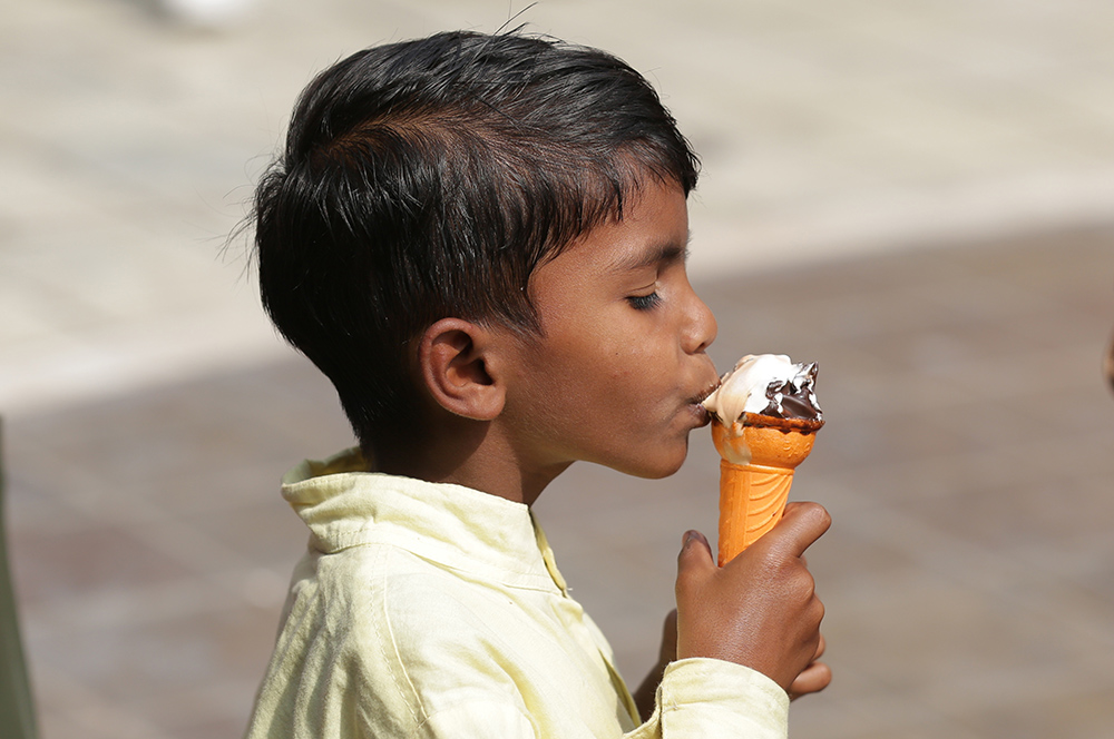 在印度阿姆利则,一名儿童吃冰淇淋消暑。(图片来源:新华社)