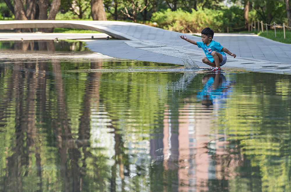 周末的北京市高温难耐,一名小朋友在朝阳区望京SOHO的水池旁戏水。据天气预报,北京当天最高气温达35摄氏度。(图片来源:中新社)