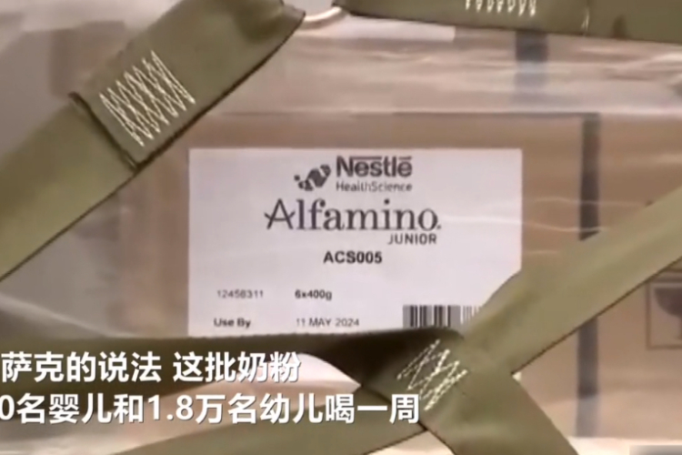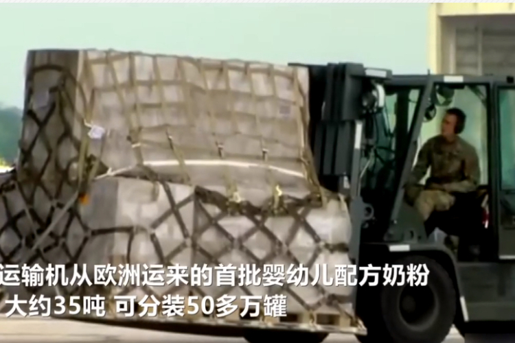 美国空军运输机从欧洲运来的首批婴幼儿配方奶粉5月22日运抵美国,大约35吨,可分装50多万罐。(图片来源:中新视频截图)