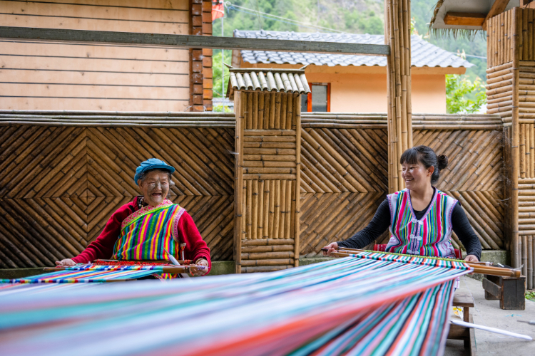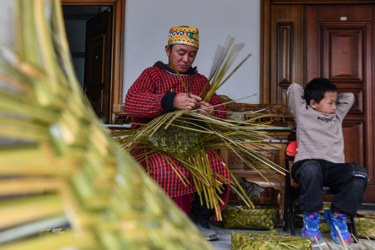 在云南省贡山独龙族怒族自治县独龙江乡迪政当村,70多岁的独龙族老人李文仕(左)和家人一起编织着独龙毯。独龙毯是当地家家户户必不可少的物品,李文仕老人从小就跟着母亲学习独龙毯编织技术,她编织的独龙毯“变身”为背包、围巾、腰带等更多样式,深受游客喜爱,一年可以给家里带来数千元的收入。(图片来源:本文图片除标注外均综编自新华社)