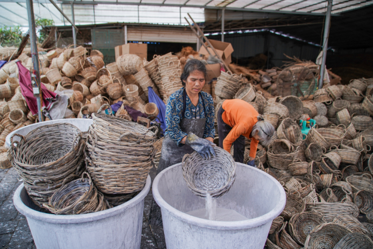 5月30日,广西河池市都安县地苏镇丹阳村,工人正在加工藤编产品。都安县盛产野生藤竹,藤编业发展历史悠久,当地常年从事编织加工的有4000多户9000多人,产品远销海外多个国家和地区。(图片来源:中新社)
