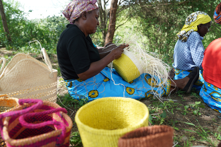 在肯尼亚首都内罗毕以东的马查科斯县加丹吉村,一群衣着美丽的妇女每天在树下熟练地编织剑麻篮。她们克服困难、互帮互助,编织的篮子远销中国、南非、加纳等国。在就业机会稀缺和教育水平低下的肯尼亚乡村,这些母亲依靠编织收入,为家庭生活和孩子的教育提供了保障。图为妇女在肯尼亚马查科斯县加丹吉村编织篮子。