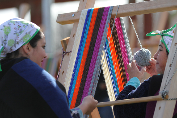 来自智利和阿根廷的426名女性马普切土著居民在智利南部阿劳卡尼亚大区的萨阿韦德拉港共同完成了一件长约900米的手工织物,希望借此让全世界更加了解马普切人及其生活方式。图为在智利南部阿劳卡尼亚大区的萨阿韦德拉港,两名马普切妇女展示编织工艺。