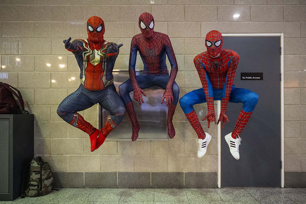 在英国伦敦,动漫形象蜘蛛侠扮演者在动漫展上展示造型。(图片来源:新华社)