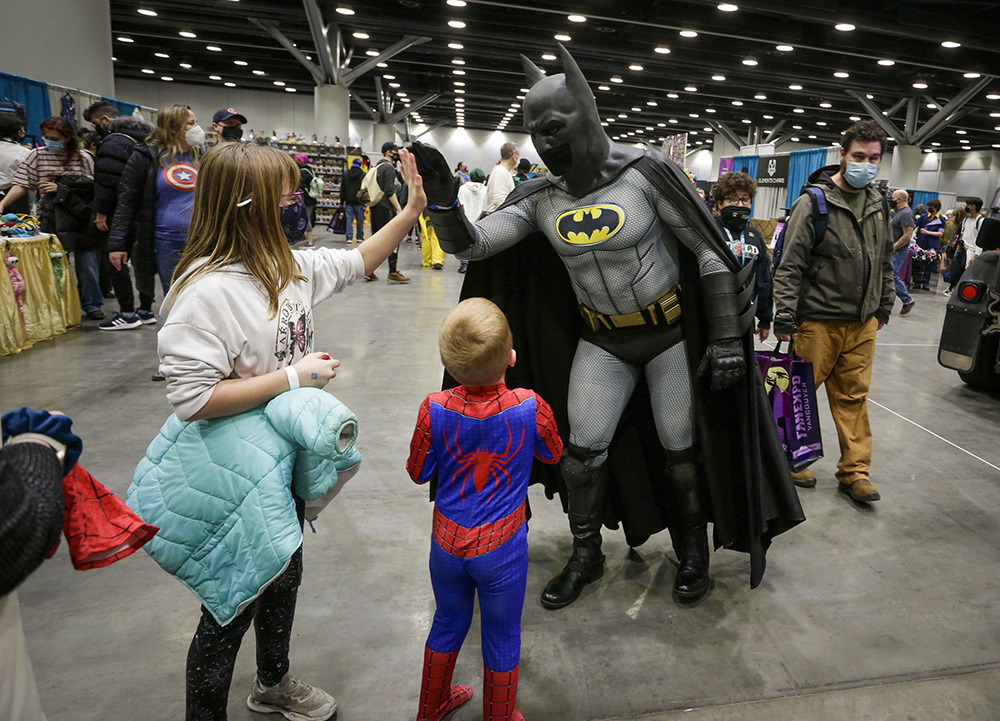 在加拿大温哥华举办的温哥华动漫迷博览会上,蝙蝠侠扮演者与人们互动。(图片来源:新华社)