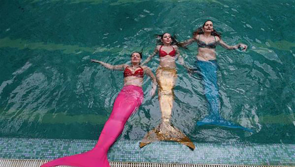 在俄罗斯首都莫斯科,三名身穿美人鱼泳装的女青年在一个美人鱼培训学校练习游泳。(图片来源:新华社)