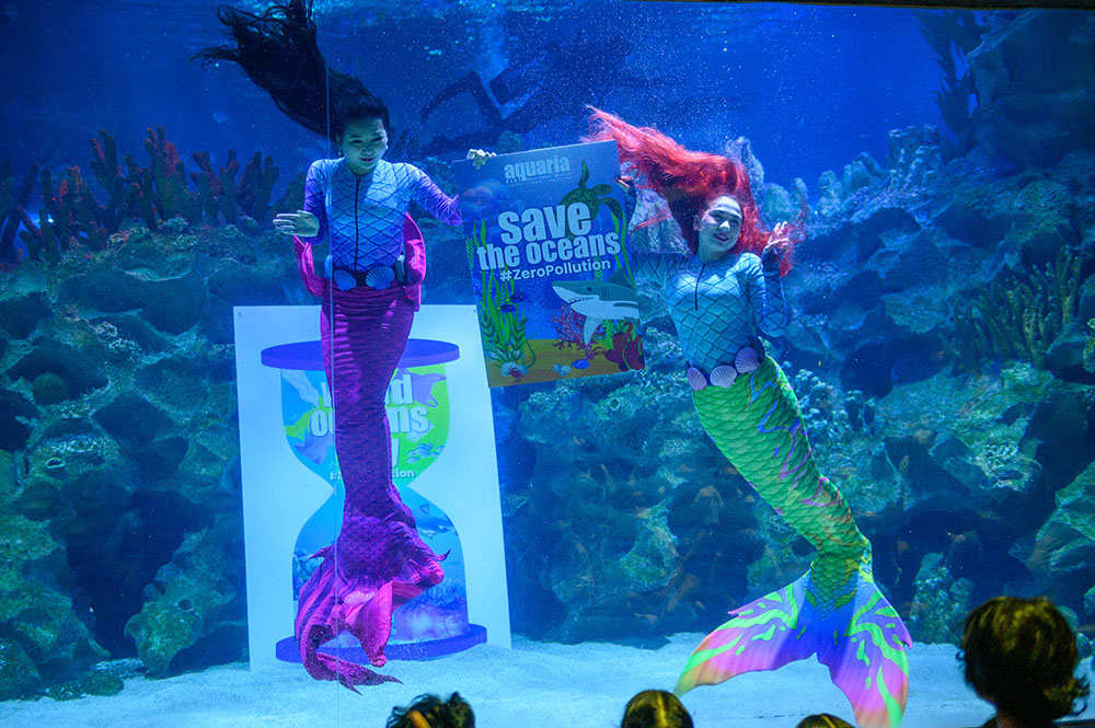 在马来西亚吉隆坡一家水族馆,两名潜水员装扮成“美人鱼”表演。(图片来源:新华社)