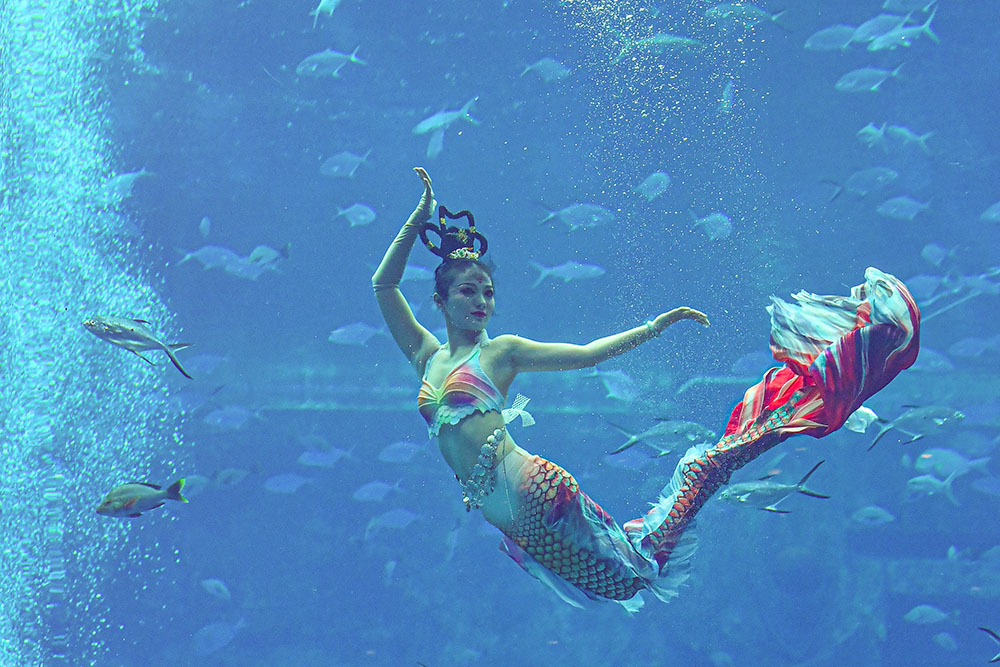 三亚亚特兰蒂斯成功挑战“最大规模的水下人鱼秀”吉尼斯世界纪录称号。(图片来源:新华社)