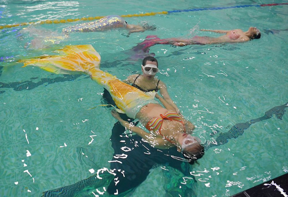 “美人鱼”的火热也催生了美人鱼表演者、美人鱼教练等新职业。在长春一家潜水俱乐部,美人鱼教练(中)正在教授课程。(图片来源:中新社)