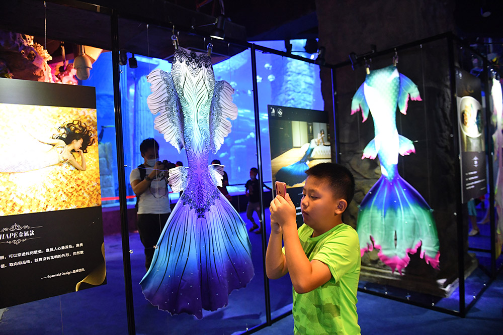 美人鱼的兴起带动了相关装备的发展。以鱼尾裙为例,材质从纺织材料到定制硅胶,售价几百元到上万元人民币不等。鱼尾裙风格从单一的仿真写实走向多元,涌现出动漫二次元风格、汉服风格等,甚至还有设计师将京剧元素融入其中。图为一位小朋友在“美人鱼”服饰展前拍摄。(图片来源:中新社)