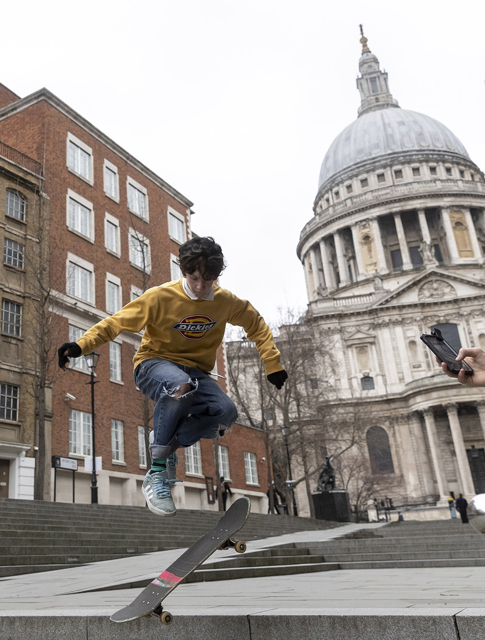 一个年轻人在英国伦敦圣保罗大教堂附近玩滑板。(图片来源:新华社)