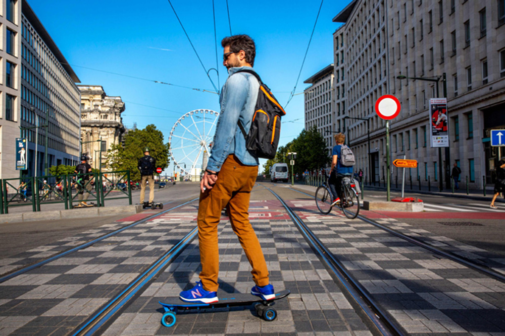 一名男子在布鲁塞尔大街上滑滑板。(图片来源:新华社)