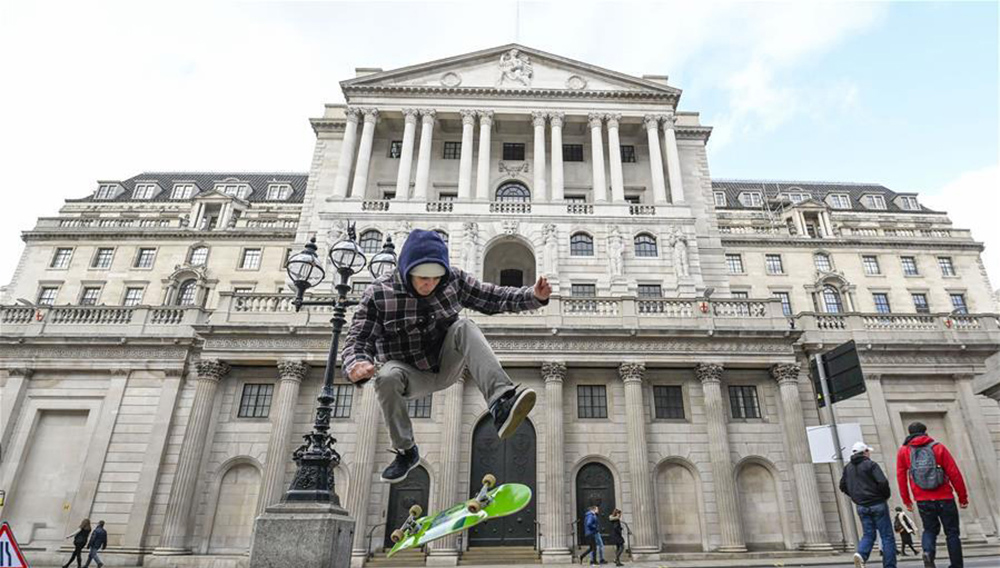 在英国伦敦,一名青年在英格兰银行大楼前玩滑板。(图片来源:新华社)