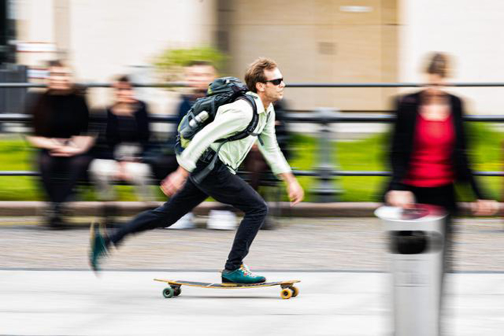 在德国首都柏林,一名男子滑滑板出行。(图片来源:新华社)