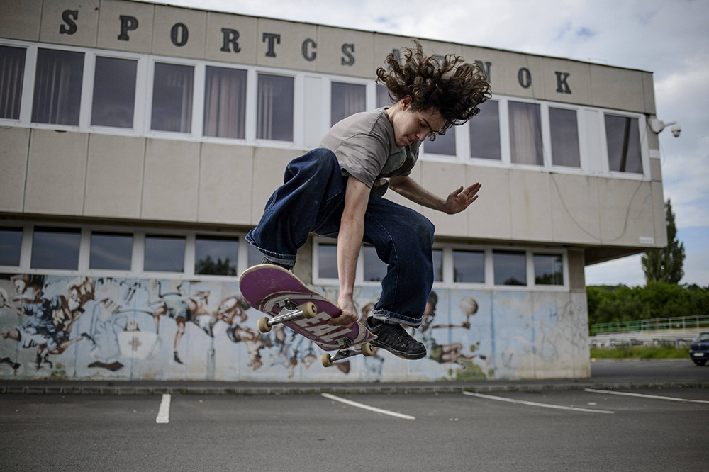 滑板爱好者在匈牙利绍尔戈陶尔扬玩滑板。(图片来源:新华社)
