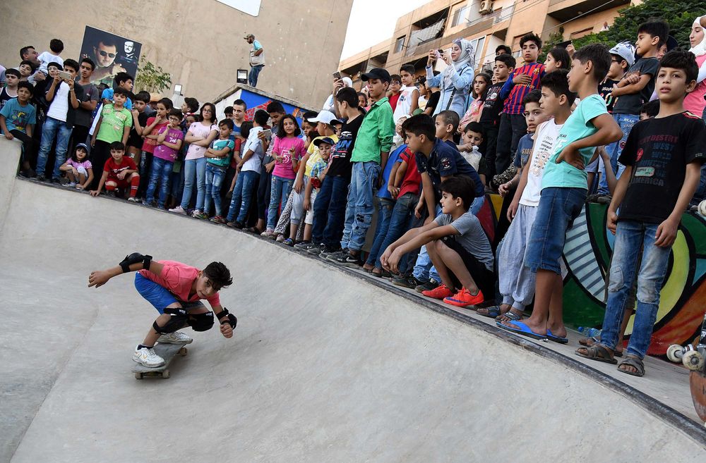 在叙利亚首都大马士革郊区一处新建的游乐设施,年轻人在玩滑板。(图片来源:新华社)