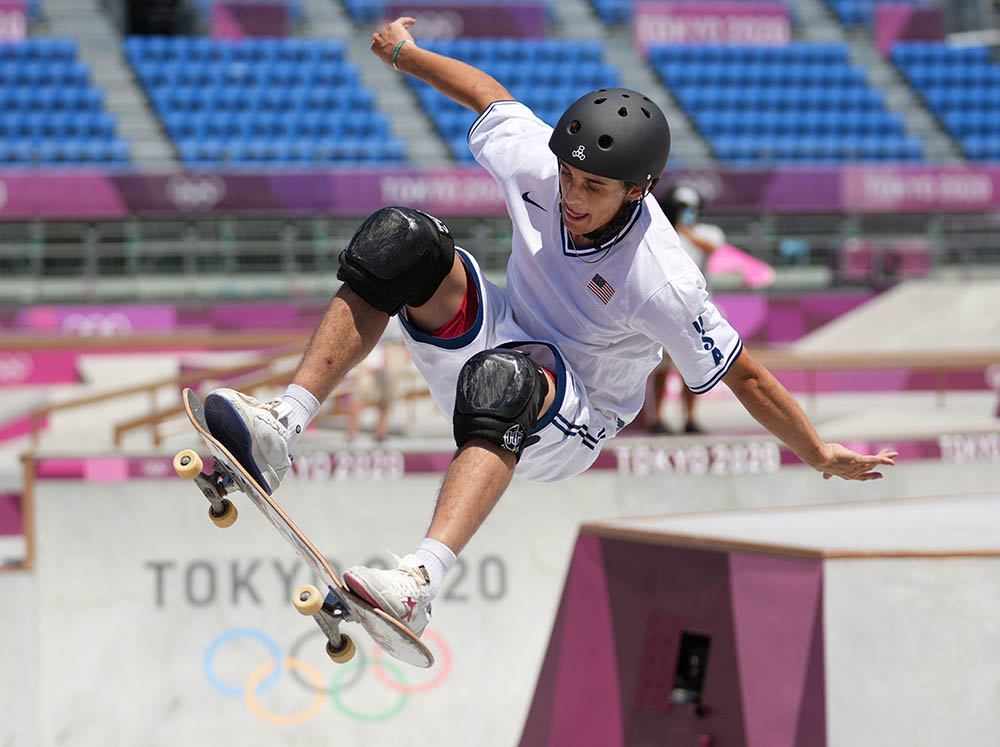 东京奥运会举行滑板男子公园赛。(图片来源:新华社)