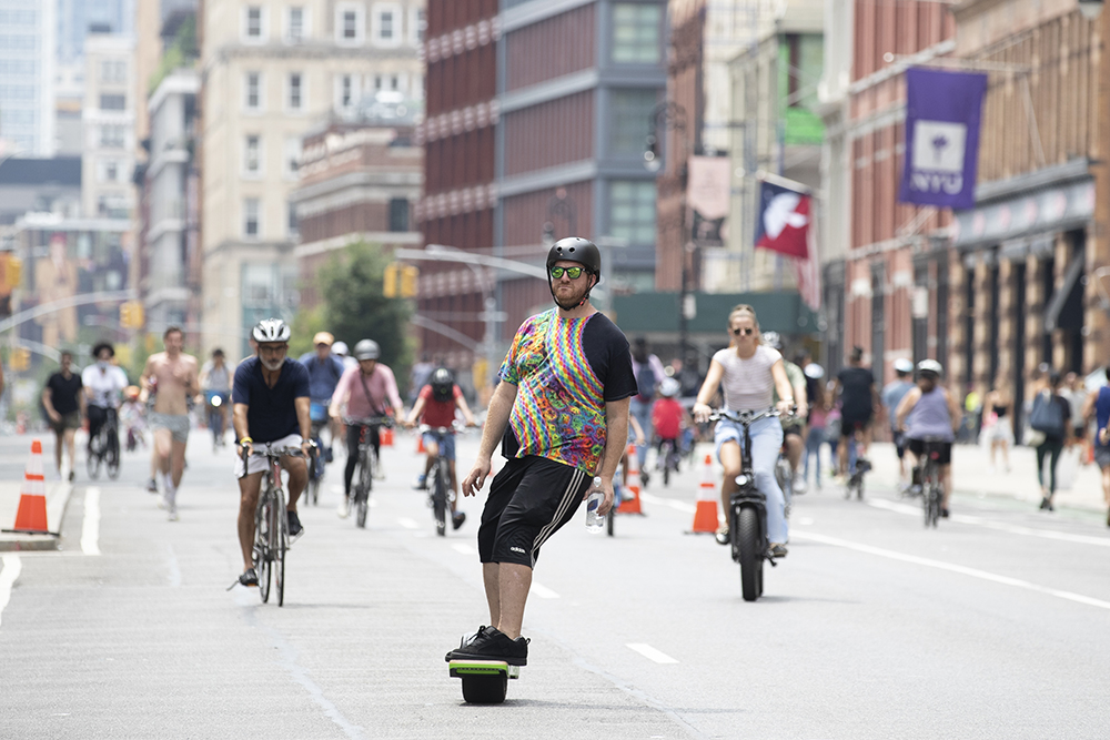 在美国纽约,市民在公园大道上踩滑板。(图片来源:中新社)