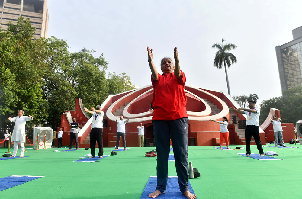 印度财政部长西塔拉曼(前)在新德里练习瑜伽。(图片来源:新华社)