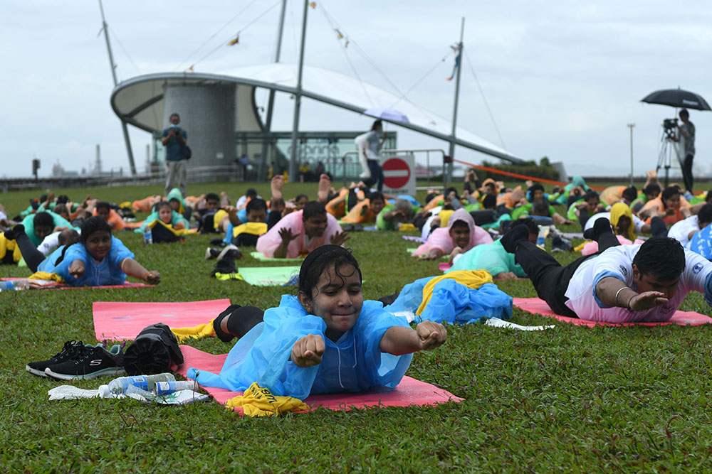 瑜伽爱好者在新加坡滨海湾举行的国际瑜伽日活动上练习瑜伽。(图片来源:新华社)
