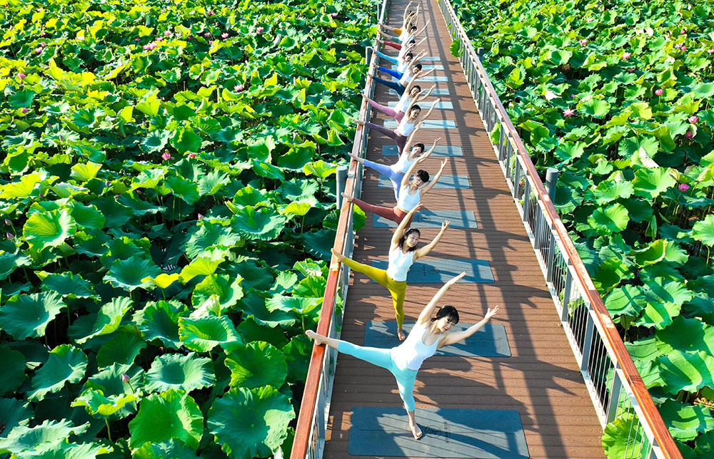 瑜伽爱好者在浙江省湖州市德清县下渚湖湿地的荷花池栈道上练习瑜伽。(图片来源:中新社)