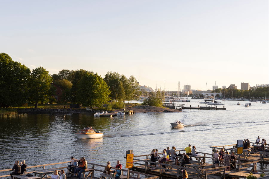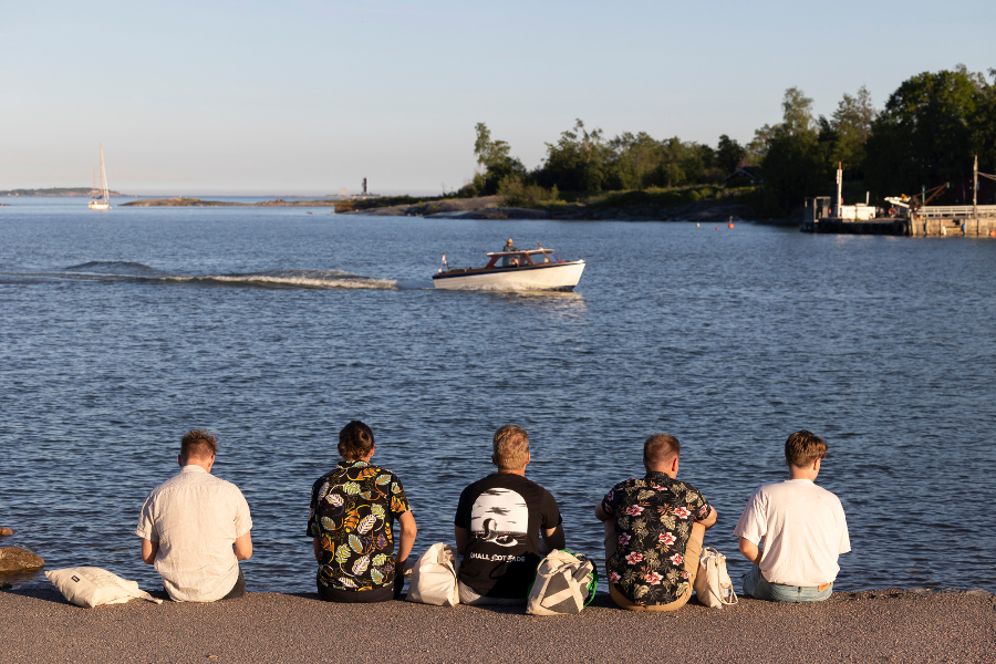 在芬兰赫尔辛基卡伊沃公园,民众在海边庆祝仲夏节。