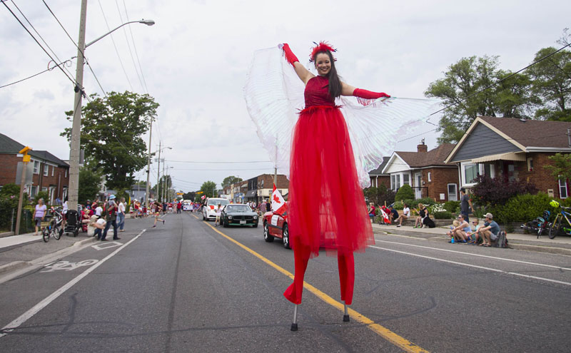 7月1日,在加拿大多伦多,高跷表演者参加国庆日游行。(图片来源:新华社)