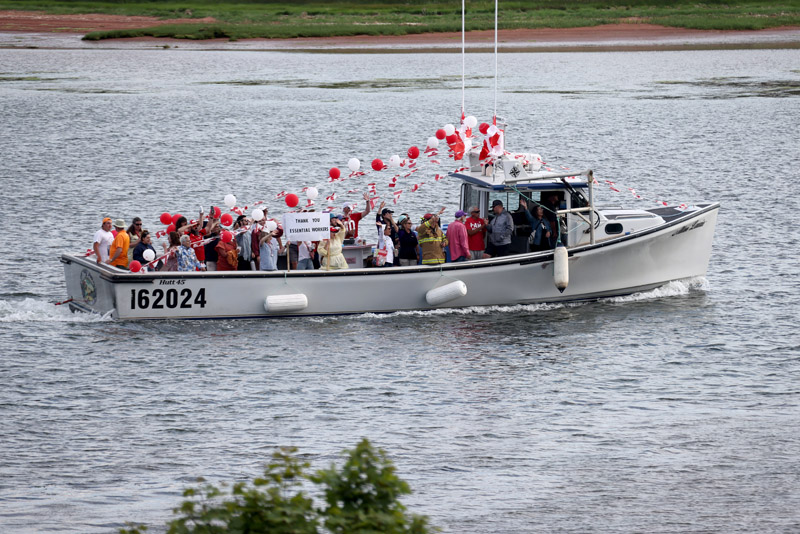 7月1日,加拿大爱德华王子岛北拉斯蒂科,民众搭乘船只庆祝加拿大国庆日,并打出字幅对新冠疫情期间的“必需行业”从业者表示感谢。(图片来源:中新社)