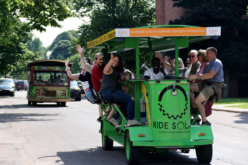 7月1日,加拿大爱德华王子岛首府夏洛特敦,民众踩着脚踏车参加加拿大国庆日公众庆祝活动。(图片来源:中新社)