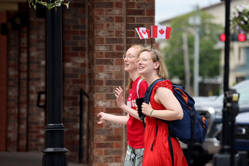 7月1日,加拿大爱德华王子岛首府夏洛特敦,两名女子头戴加拿大国旗,准备参加国庆日公众庆祝活动。(图片来源:中新社)