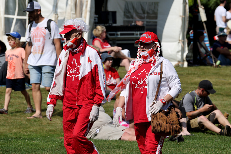 7月1日,加拿大爱德华王子岛首府夏洛特敦,两名市民身着加拿大国旗元素的服装在一公园参加加拿大国庆日公众庆祝活动。(图片来源:中新社)