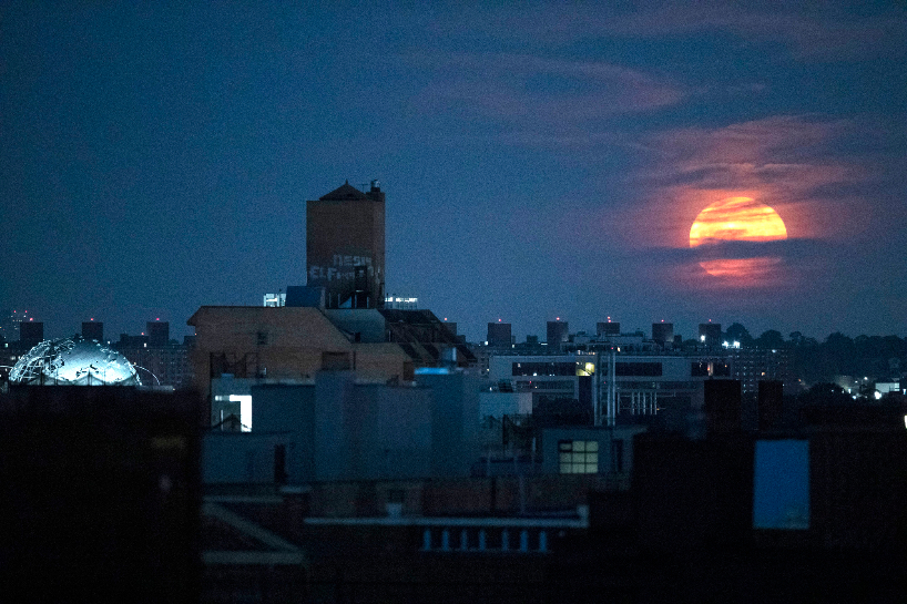 7月13日凌晨,美国纽约,一轮圆月在地平线附近的天空上。(图片来源:中新社)
