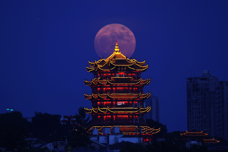 在中国武汉黄鹤楼附近拍摄的“超级月亮”。(图片来源:新华社)