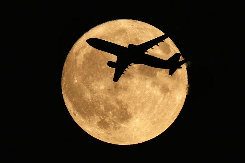 在中国天津,一架飞机从“超级月亮”前飞过。这轮“超级月亮”是年度“最大满月”。(图片来源:中新社)