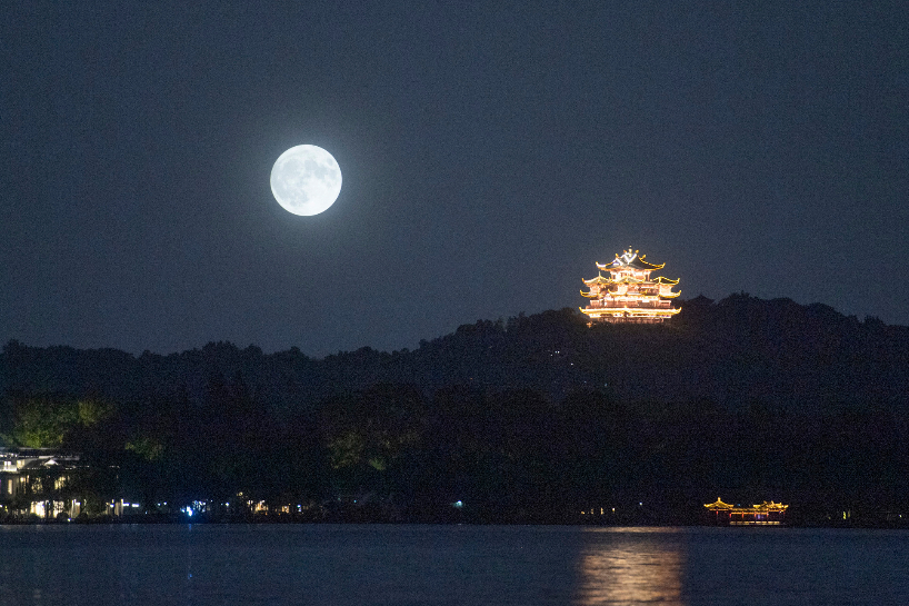 2022年度最大的“超级月亮”在浙江杭州西湖城隍阁附近“亮相”。(图片来源:中新社)