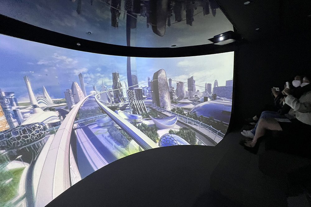 在位于韩国首尔的新信息通讯技术体验馆内,参观者乘坐“飞行穿梭机”游览“未来城市”。(图片来源:新华社)