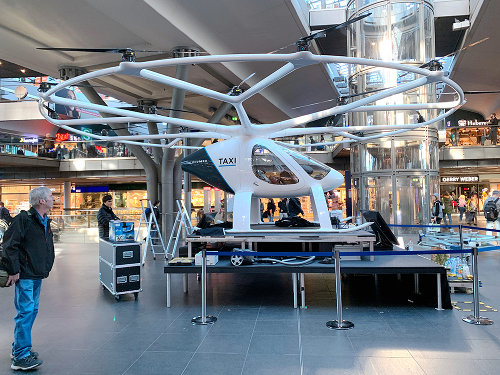 德国Volocopter公司在柏林火车总站内展示其推出的“空中出租车”原型机,吸引过往乘客驻足端详。(图片来源:中新社)