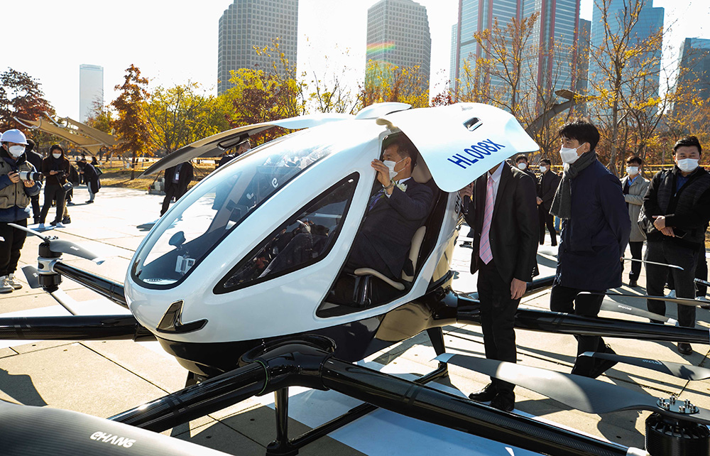 韩国国土交通部与首尔市政府进行“载人空中出租车”试飞活动,展示并检测空中飞行技术应用等,这是韩国首次试飞“空中出租车”。图为“空中出租车”试飞。(图片来源:中新社)