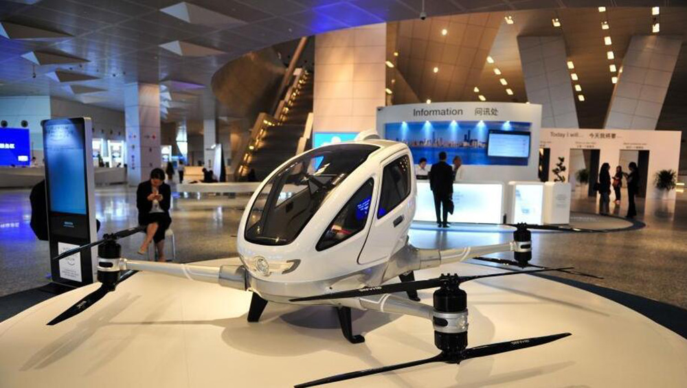 中国大连国际会议中心参观全球首款自动驾驶载人飞行器。(图片来源:中新网)