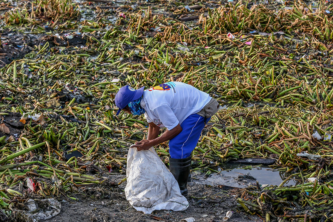 9月17日,在菲律宾马尼拉,一名工作人员沿着马尼拉湾清理岸边垃圾。