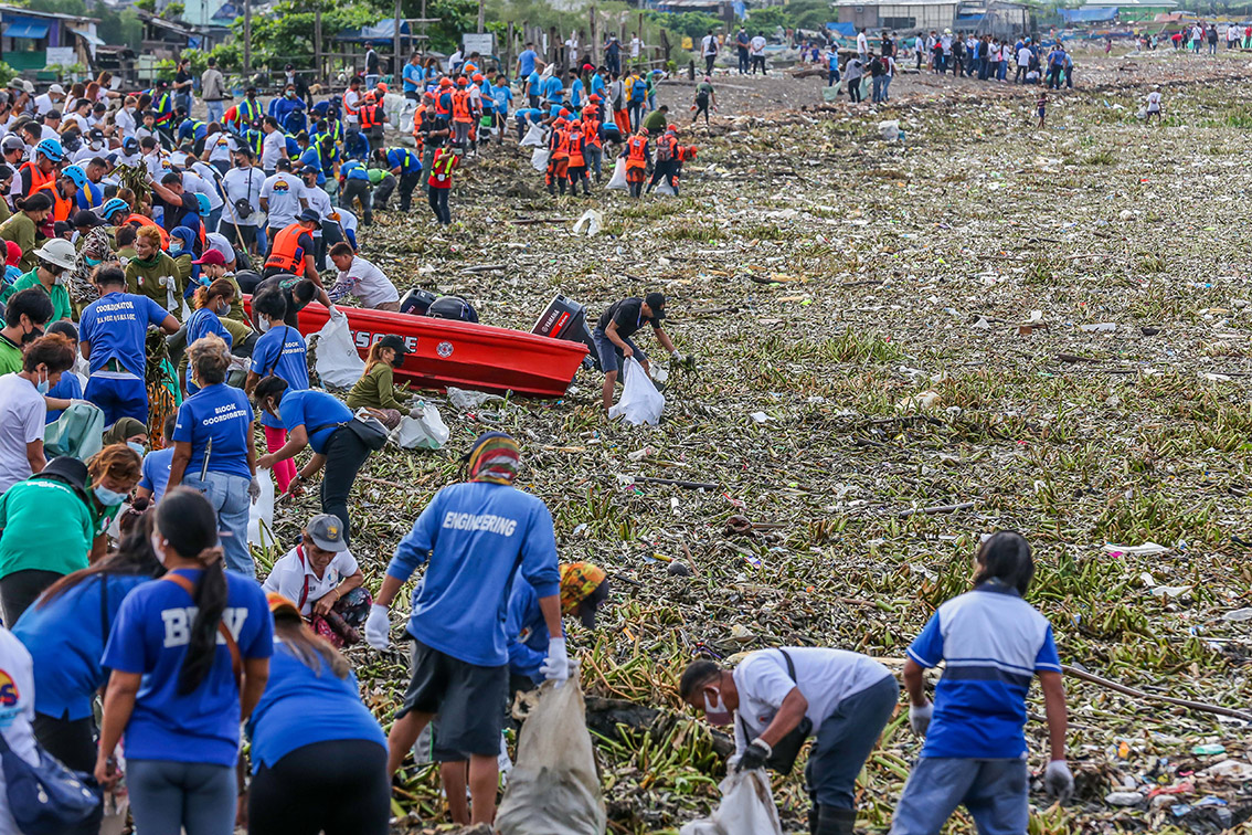 9月17日,在菲律宾马尼拉,人们沿着马尼拉湾清理岸边垃圾。