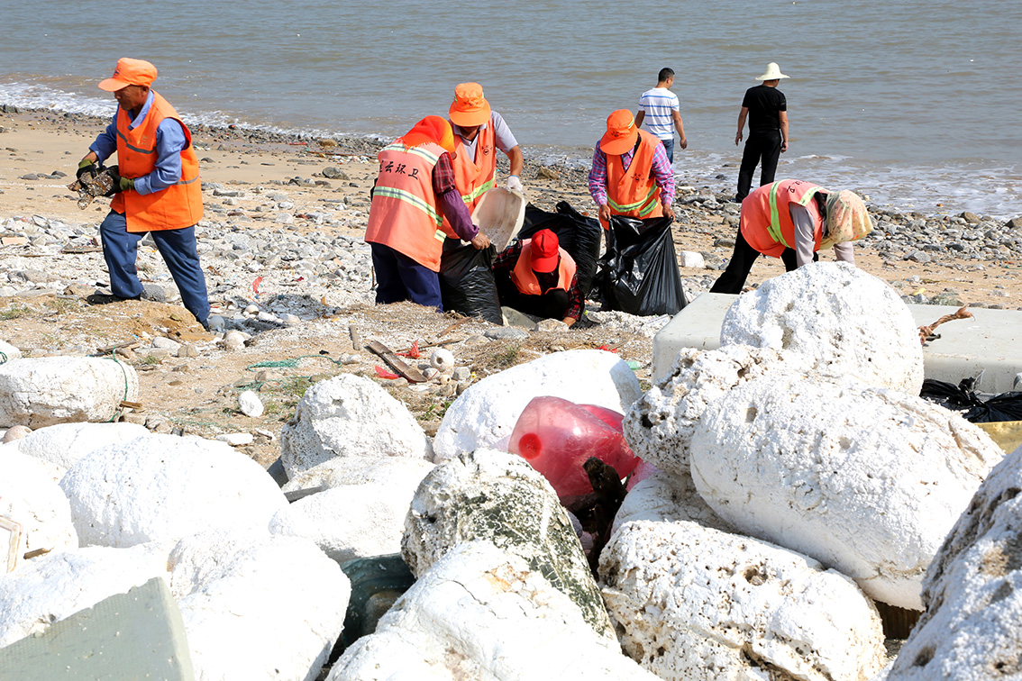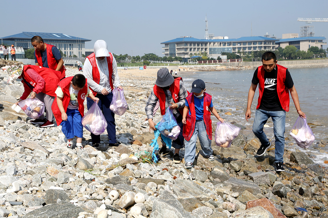 2022年9月18日,江苏省连云港市连云区组织环卫工和志愿者来到海边清理垃圾,以实际行动爱护海洋环境,守护我们共同的家园。每年9月的第三个周日是 “世界清洁地球日”。(图片来源:中新社)
