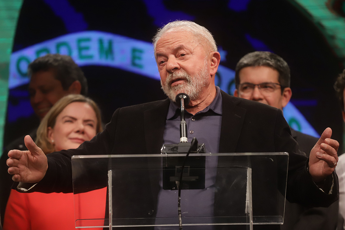 10月2日,在巴西圣保罗,卢拉在总统选举首轮投票结果出炉后发表讲话。