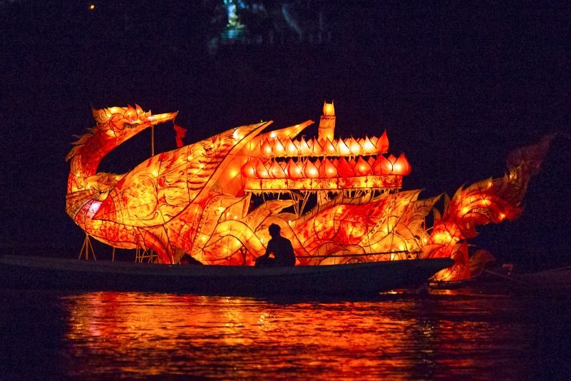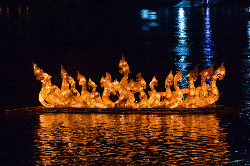 灯船节的龙舟灯船漂浮在老挝琅勃拉邦湄公河的水面上。(图片来源:本文图片均自新华社)