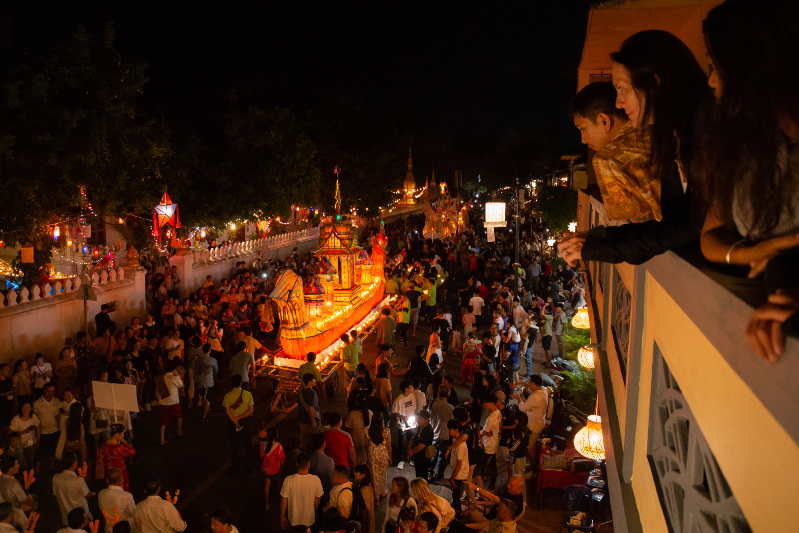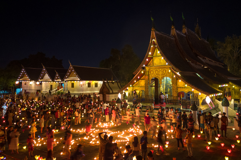 民众在老挝琅勃拉邦古城点亮花灯。