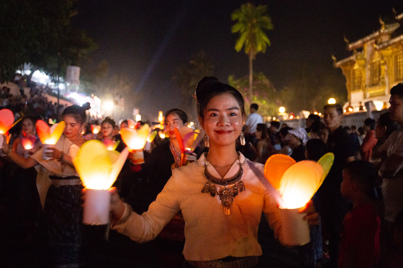 在老挝琅勃拉邦古城,民众手持花灯庆祝灯船节。