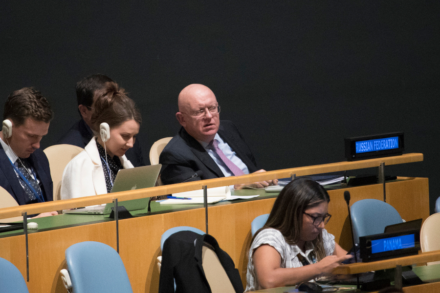 俄罗斯常驻联合国代表涅边贾关注大会表决。(图片来源:中新社)