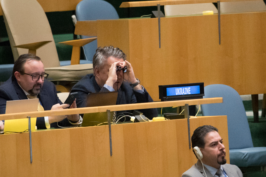 乌克兰常驻联合国代表谢尔吉·基斯利茨亚用望远镜关注大会发言。(图片来源:中新社)