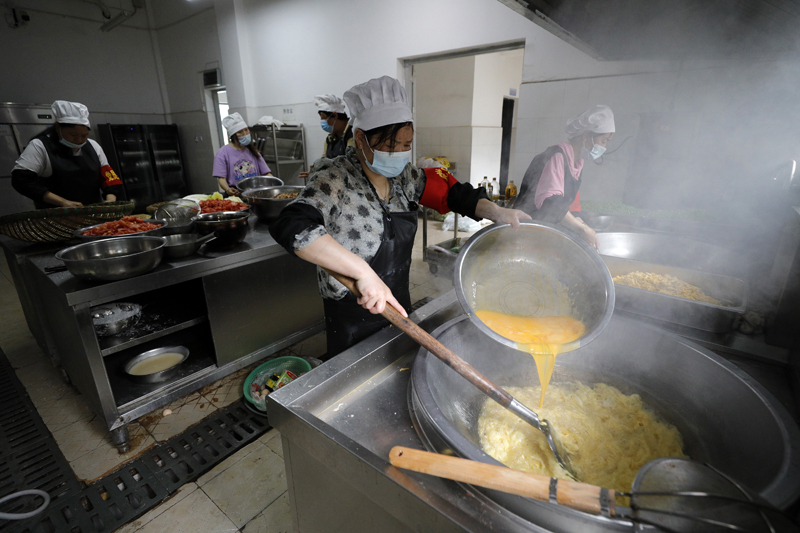 中国雅安市“6·1”芦山地震发生后,在芦山县太平镇太平中学安置点,学校食堂的厨师在准备当天的午饭。