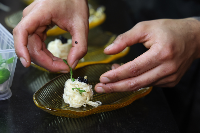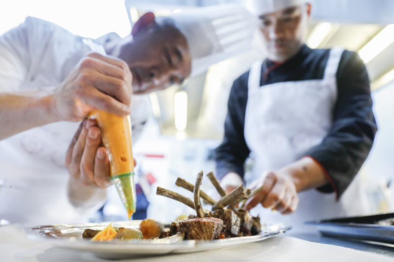 在北京举行的“好味法兰西”发布活动中,厨师在现场进行摆盘装饰。